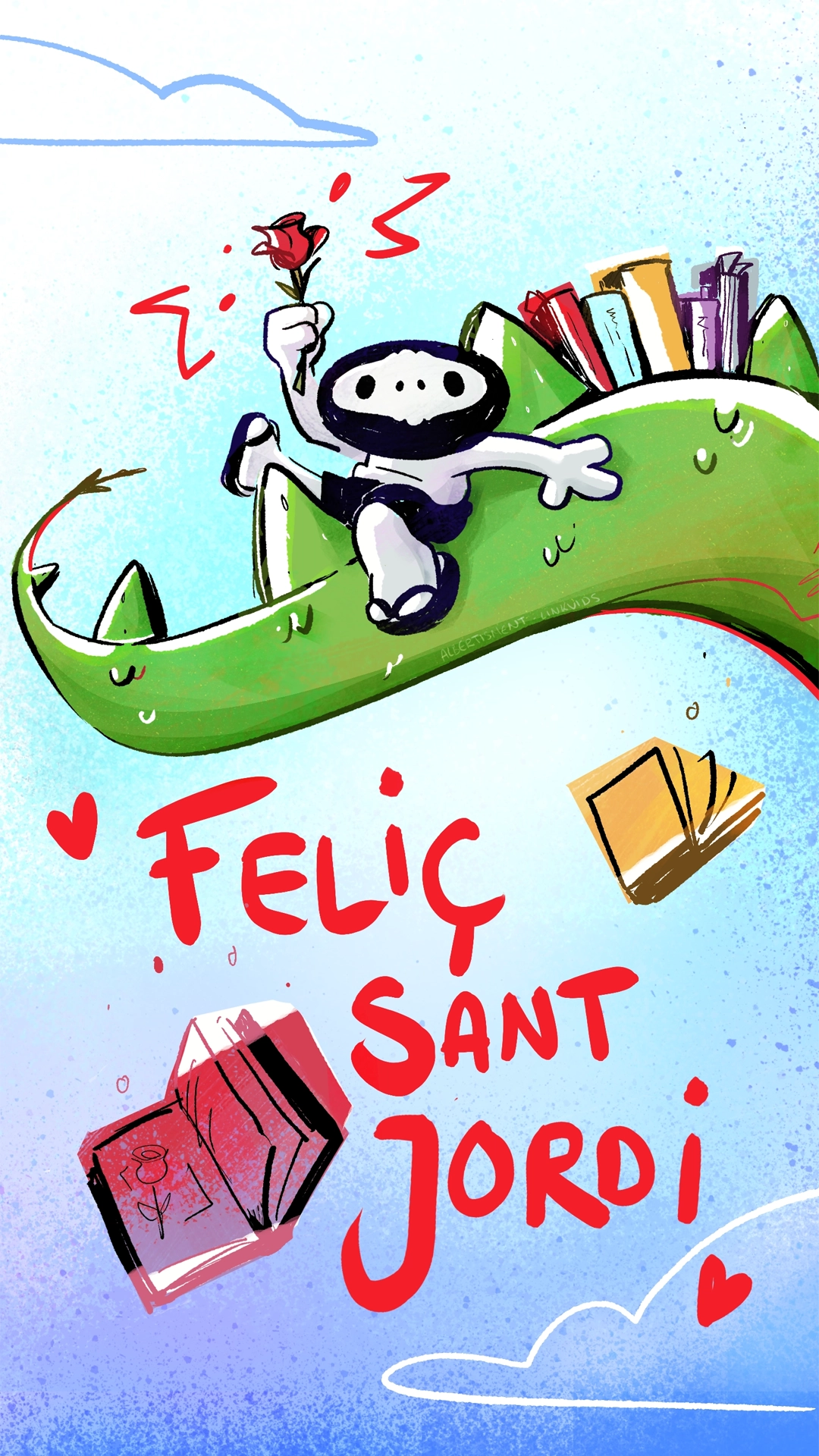 Below, another three postcards we produced at Linkvids. The first one was the first animation I did of the character as a concept of what we could make . For the one in the middle, I did the 2D FX and the compositing, while Edu Coll did the 3D design, rigging and animation and illustration. The last one is an illustration I did for social media celebrating St Jordi, a national holiday in Catalunya.